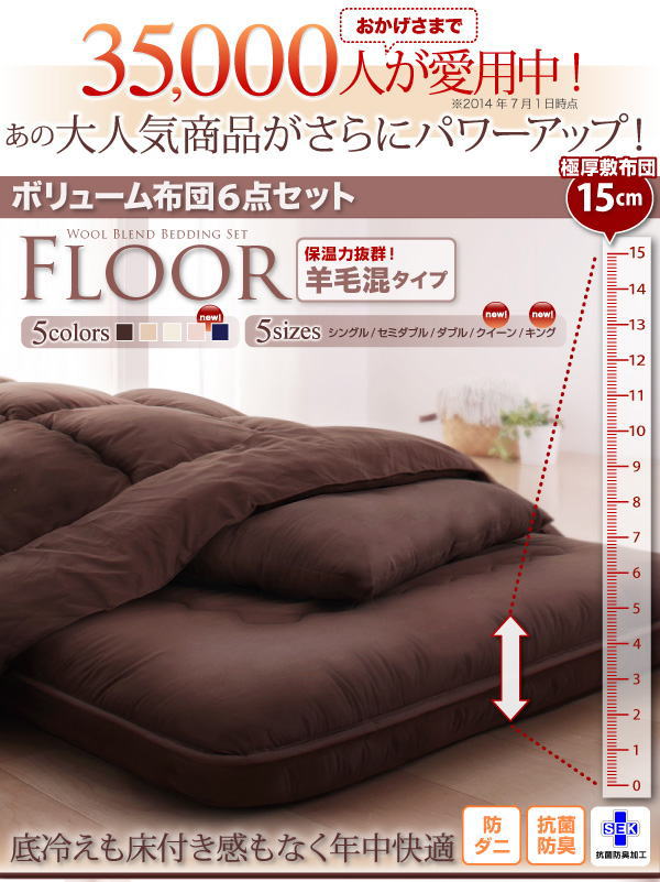 吸湿力に優れる羊毛に防ダニ・抗菌防臭機能をプラス! 充実のセット内容はコチラ ボリューム羊毛混敷布団 羊毛混掛布団 枕 掛布団カバー 敷布団シーツ 枕カバー 商品名 ボリューム布団6点セット FLOOR フロア 羊毛混タイプ キング8点セット 配送について こちらの商品はメーカーより直送いたします。