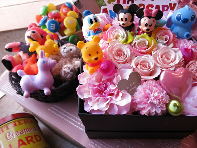 クリスマスプレゼント ディズニー 花束風 箱を開けてサプライズ ミッキー ミニー ドナルド スティッチ プーさん入り ボックス レインボーローズ プリザーブドフラワー入りギフト