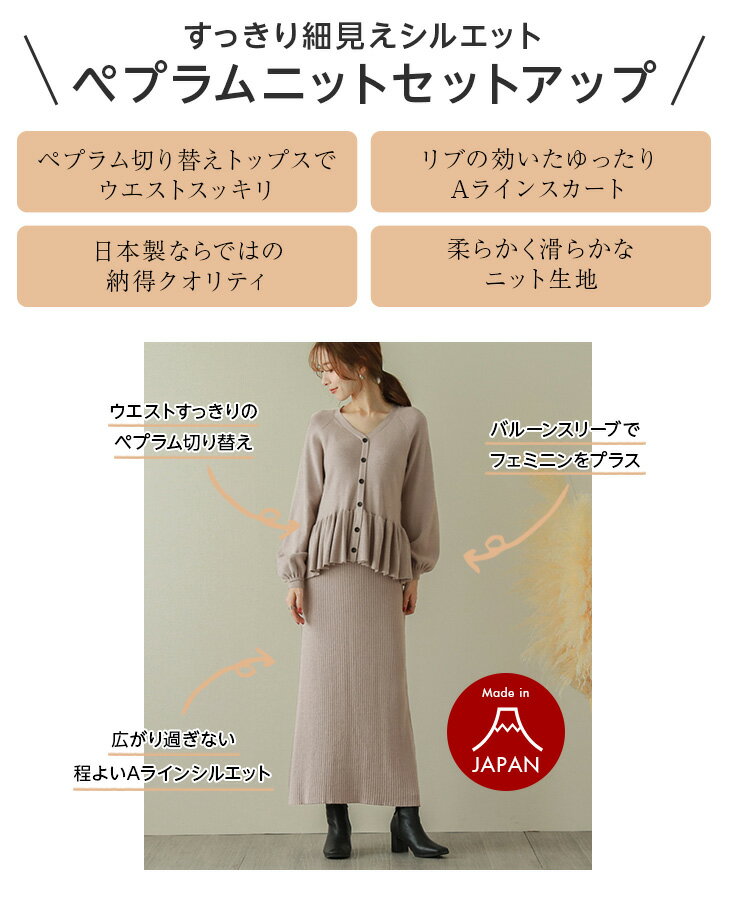 日本製 ペプラム ニットセットアップ スカート レディース 上下セット 長袖 Vネック きれいめ フェミニン Aライン ウエストゴム オフィス 仕事 トップス ボトムス 大人可愛い 30代 40代 2022春夏新作 フリー 【lgww-at4911】【即納:1-5営業日】宅込
