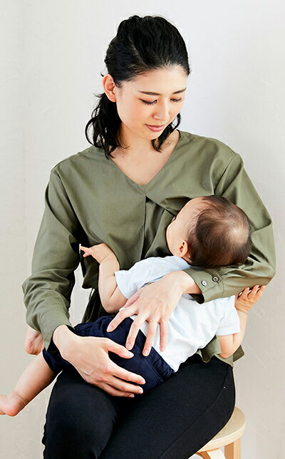 授乳テストで授乳のしやすさを追求した授乳口 授乳中:ケープなしでも肌が見えません 圧倒的に使いやすいモーハウスの授乳口 モーハウスの授乳服ならではの、ボタンもファスナーもない授乳口。