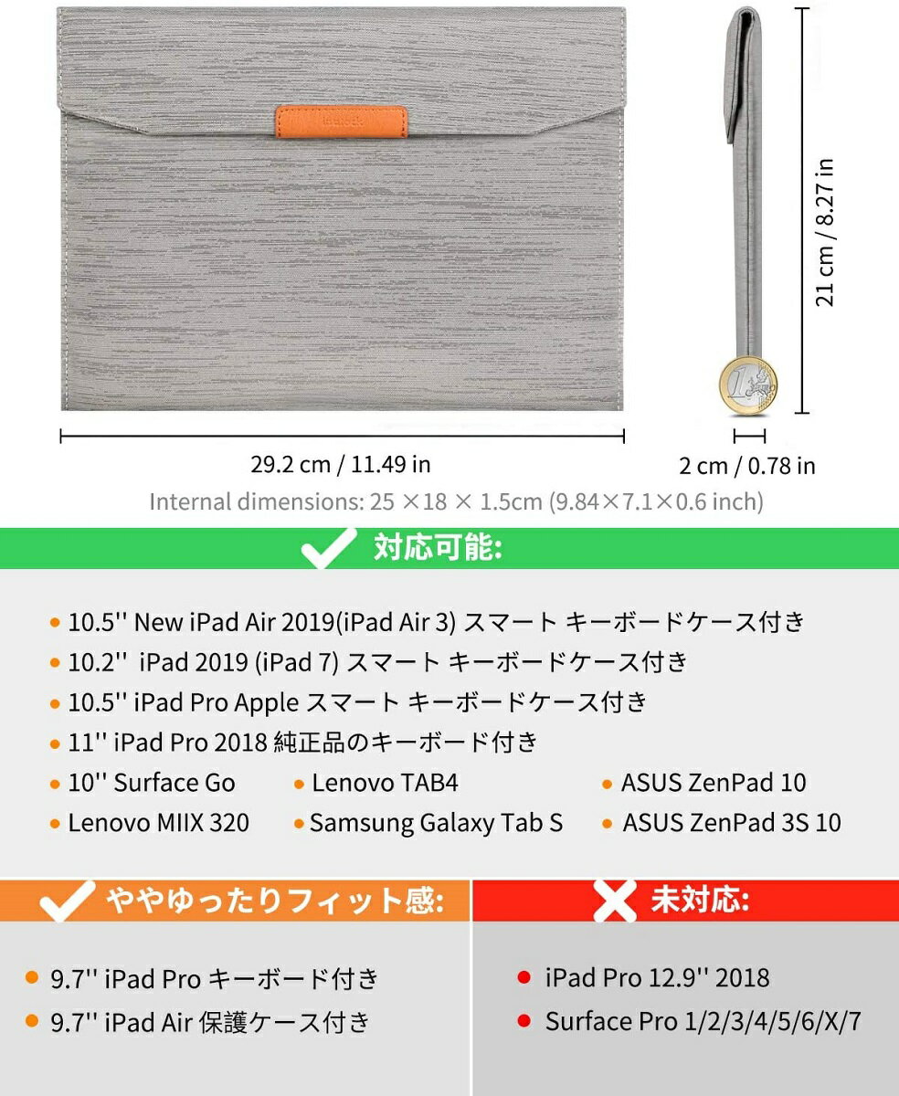 内部寸法:25 x 18 x 1.5 cm 対応機種: 11インチiPad Pro 2020&2018 10.2インチ iPad 2019 10.9インチiPad Air 2020(iPad Air 4) 10.5インチiPad Pro 10.5インチiPad Air 2019(iPad Air 3) 9.7インチ iPad /iPad Air 9.7 10インチ Surface Go Acer Chromebook Tab 10 10.1インチ Samsung Galaxy Tab 3D耐衝撃保護:バンプテクスチャを備えた3Dクッションライニングは、衝撃からタブレットをより強力に保護し、摩擦を減らし、タブレットの取り出しを易くにします。