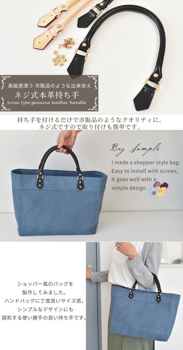)ネジ式 本革バッグ持ち手2本セット 全長40cm本革ですので、とても高級感があり、作品に付けるだけで市販品のようなクオリティのバッグに。