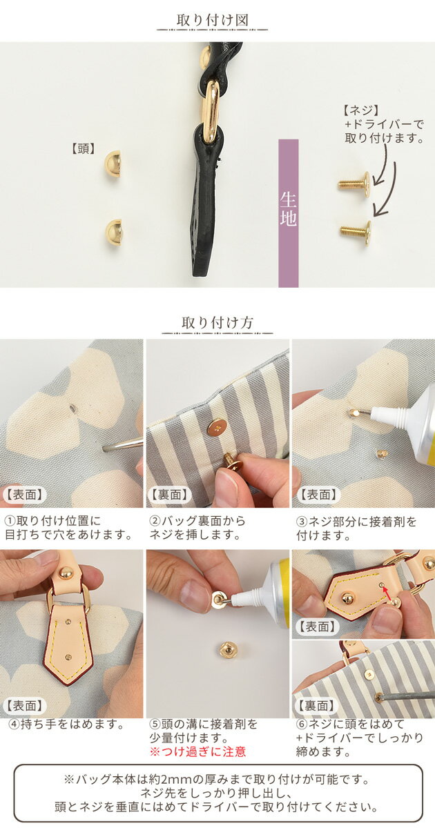■素材本革■数量 2本セット ネジ8組 ■ゆうパケット4点まで可■取り付け方※使用できるバッグの厚みは約2mmまでとなります。