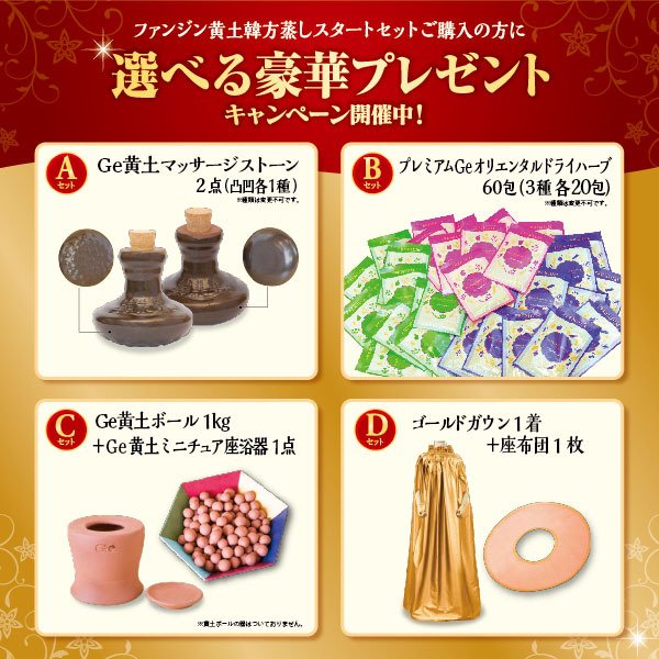 Aセット:Ge黄土マッサージストーン2点(凸凹各1種) Bセット:プレミアムGeオリエンタルドライハーブ60包(3種各20包) Cセット:Ge黄土ボール1kg+Ge黄土ミニチュア座浴器1点 Dセット:ゴールドガウン1着+座布団1枚 【付属品】 ・保証書 ・認証書 ・説明書 弊社での購入メリット ファンジンジャパンスタッフが購入後もご相談やお悩みをサポート致します。