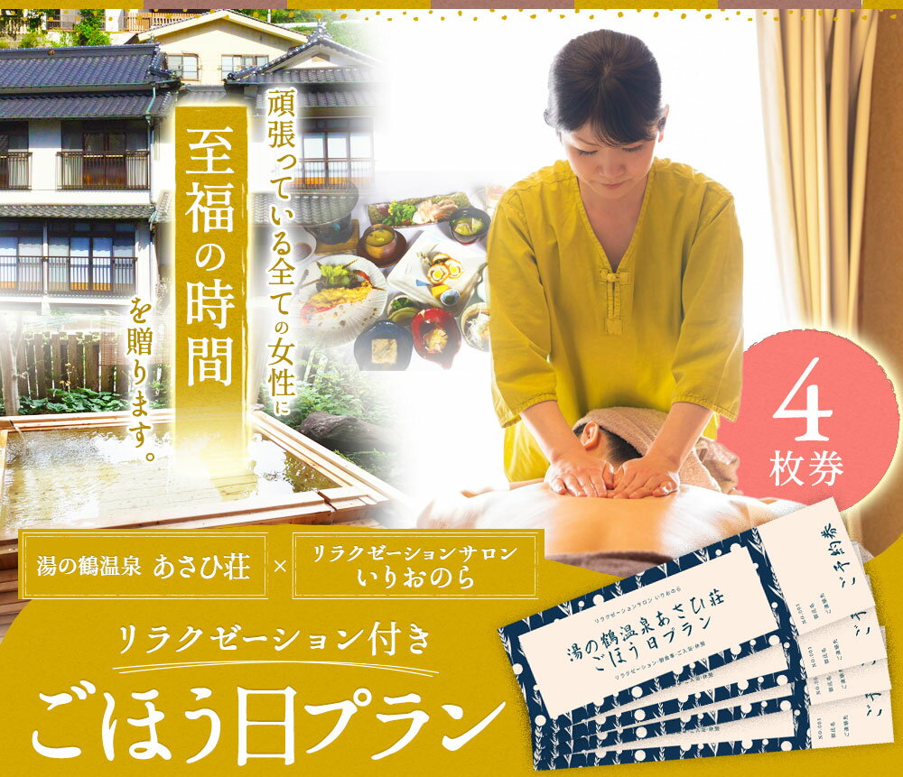 商品説明 名称 湯の鶴温泉あさひ荘 ごほう日プラン 4枚券 内容 1.リラクゼーションよもぎオイルを使用しオールハンドで全身をマッサージいたします。