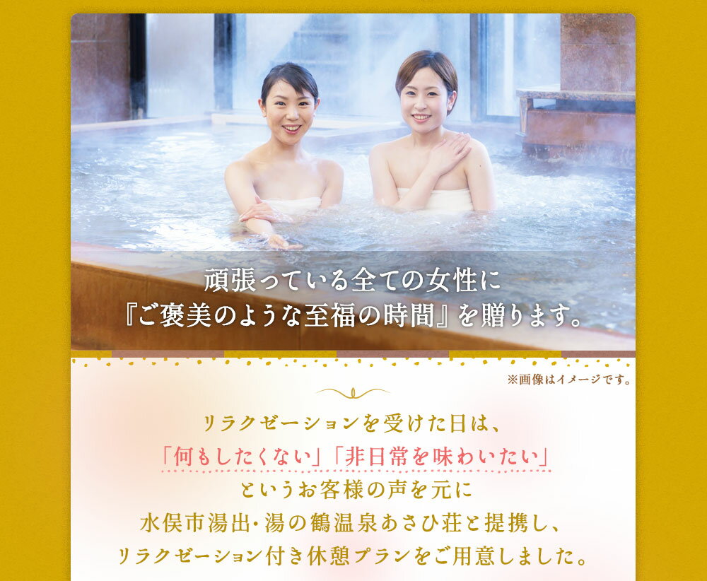 リラクゼーションを受けた日は「何もしたくない」「非日常を味わいたい」というお客様の声を元に水俣市湯出・湯の鶴温泉あさひ荘と提携し、リラクゼーション付き休憩プランをご用意しました。