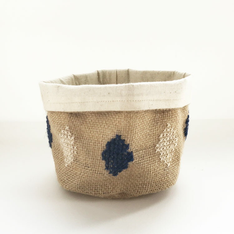 ジュートに手刺繍のクロスステッチを施したバスケット。