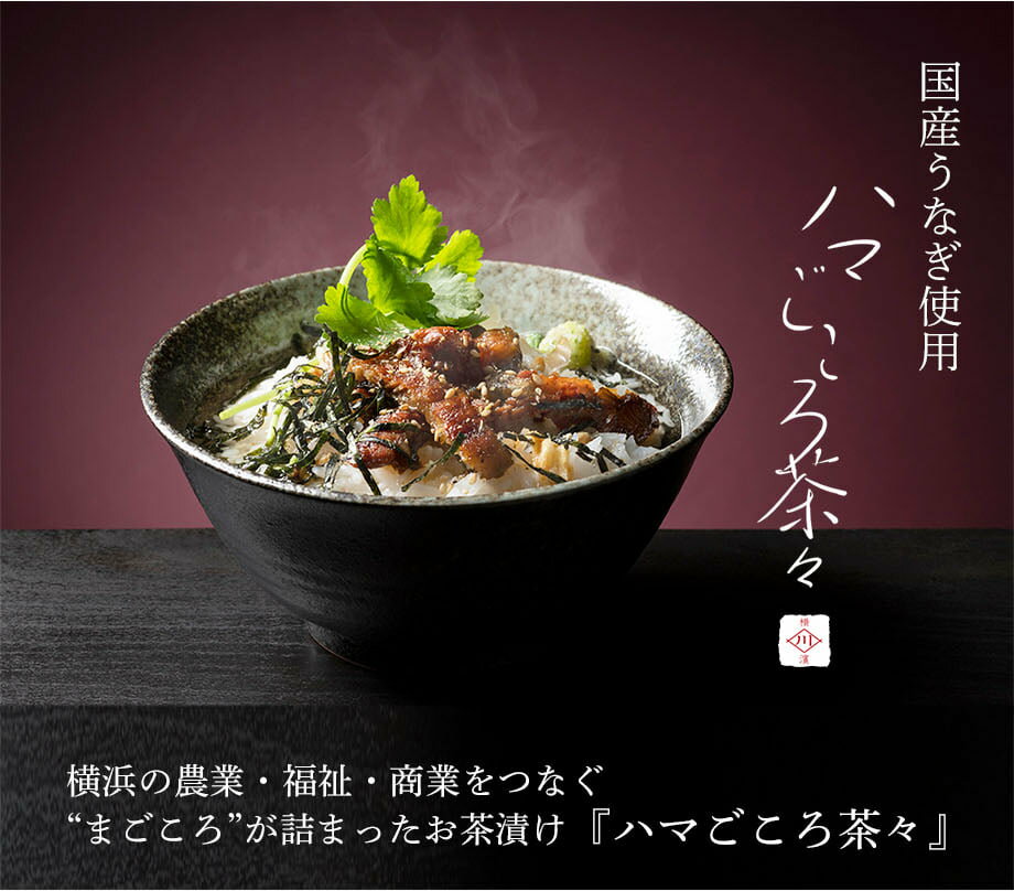 横浜の農業・福祉・商業をつなぐ”まごころ”が詰まったお茶漬け『はまごころ茶々』 <セット内容> ●国産うなぎ2切れ ●備長炭火入れ静岡茶(和染め茶缶入り)50g ●ミル入りお茶漬けの素 ●きざみ海苔 ●竹かご入り ●風呂敷包み 【ご注意】 ●限定数を超えた場合、缶の柄・風呂敷の色など変更の場合がございます。
