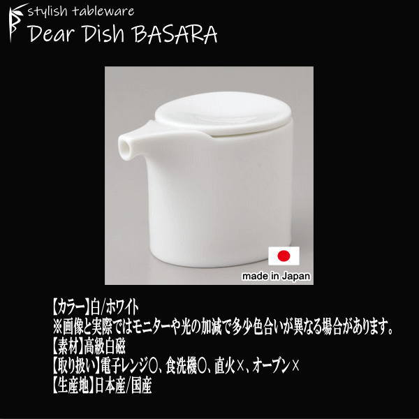 【素材】高級白磁 【取り扱い】電子レンジ○、食洗機○、直火×、オーブン× 【生産地】国産/美濃焼(瑞浪焼き) 【用途】調味料入れ、醤油入れ、ソース入れ ※粘性の強いものや固形物が入ったものは詰まる恐れがあります。