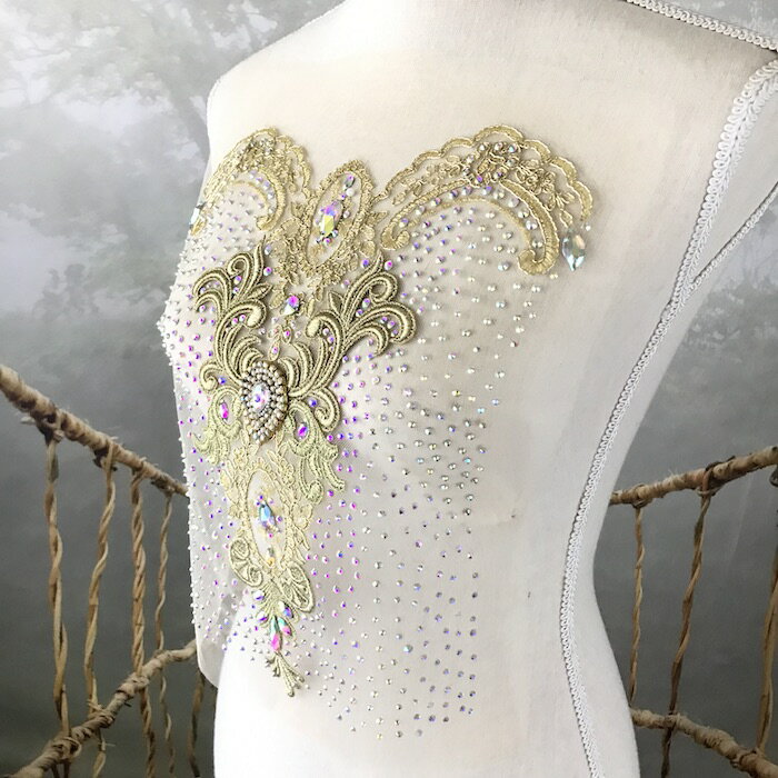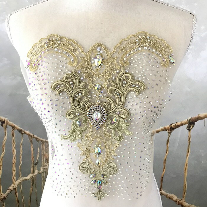 ストーンが美しいゴールドのチュール付きネックラインモチーフです。