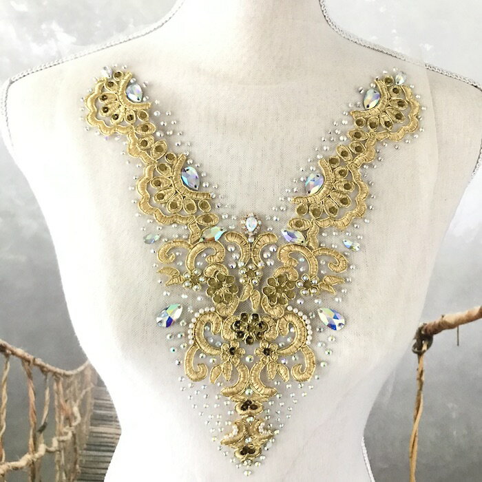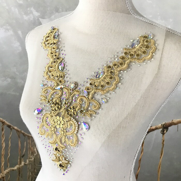 ストーンが美しいゴールドのチュール付きネックラインモチーフです。