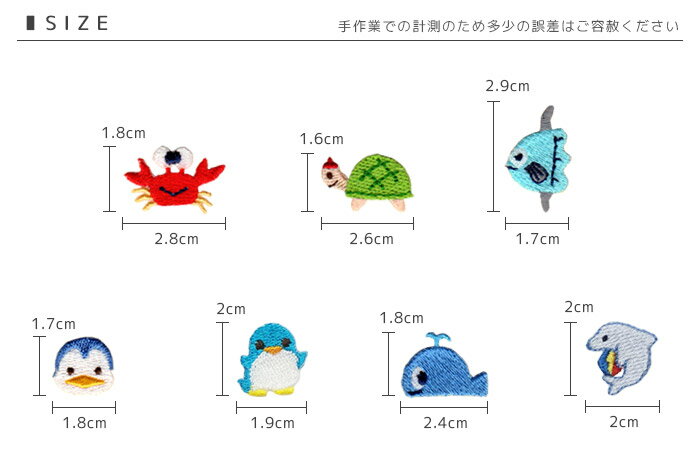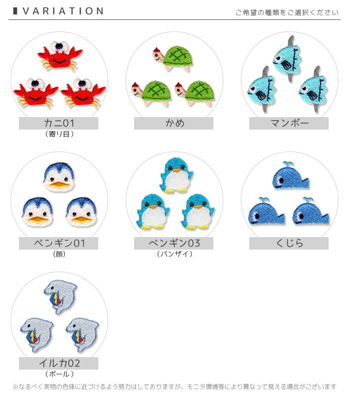 海辺の生き物 海洋生物 かに カニ かめ カメ マンボー ぺんぎん ペンギン くじら クジラ イルカ 商品詳細 サイズ (縦/横の順) カニ01(寄り目)(1.8cm/2.8cm) カニ02(離れ目)(1.8cm/3cm) かめ(1.6cm/2.6cm) マンボー(2.9cm/1.7cm) ペンギン01(顔)(1.7cm/1.8cm) ペンギン03(バンザイ)(2cm/1.9cm) くじら(1.8cm/2.4cm) イルカ02(ボール)(2cm/2cm) ※実物での計測となりますので多少の誤差はご了承ください 素材 (基布)ポリエステル (上糸)レーヨン100% (下糸)ポリエステル100% 裏面 アイロン接着[EVA樹脂] 生産国 日本製 取扱い注意 ※あて布を当ててアイロン接着することをお勧めします。