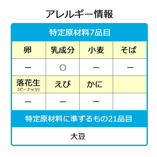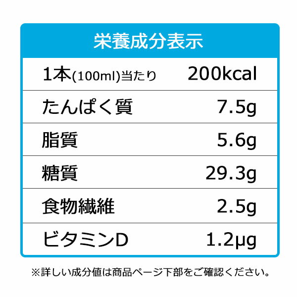 栄養成分表示 1本(100ml)当たり 成分 含量 成分 含量 エネルギー(kcal) 200 モリブデン(μg) 10.0 たんぱく質 (g) 7.5 セレン(μg) 12 脂質 (g) 5.6 ヨウ素(μg) 30 炭水化物 (g) 31.8 塩素(mg) 120 食塩相当量 (g) 0.33 ビタミンA (μg) 120 食物繊維 (g) 2.5 ビタミンD (μg) 1.2 糖質(g) 29.3 ビタミンE (mg) 6.0 水分 (g) 68.9 ビタミンK (mg) 19 灰分(g) 1.1 ビタミンB1 (mg) 0.30 カリウム(mg) 180 ビタミンB2 (mg) 0.40 カルシウム(mg) 120 ナイアシン当量 (mgNE) 5.5 マグネシウム(mg) 40 ビタミンB6 (mg) 0.60 リン(mg) 140 ビタミンB12 (μg) 1.2 鉄(mg) 1.5 葉酸 (μg) 60 亜鉛(mg) 2.0 ビオチン (μg) 30 銅(mg) 0.10 パントテン酸(mg) 1.2 マンガン(mg) 0.46 ビタミンC (mg) 100 クロム(μg) 6.0 コリン(mg) 15.2 アレルギー情報 乳・大豆 関連商品