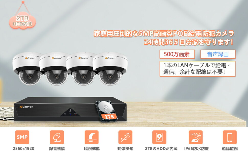 防犯カメラ poe 屋外 ドーム型 500万画素 4台セット 家庭用 JENNOV 監視カメラセット 有線 音声記録 IP66防水防塵 2TBHDD内蔵 録画機能付き スマホ連動 人感センサー 一年保証