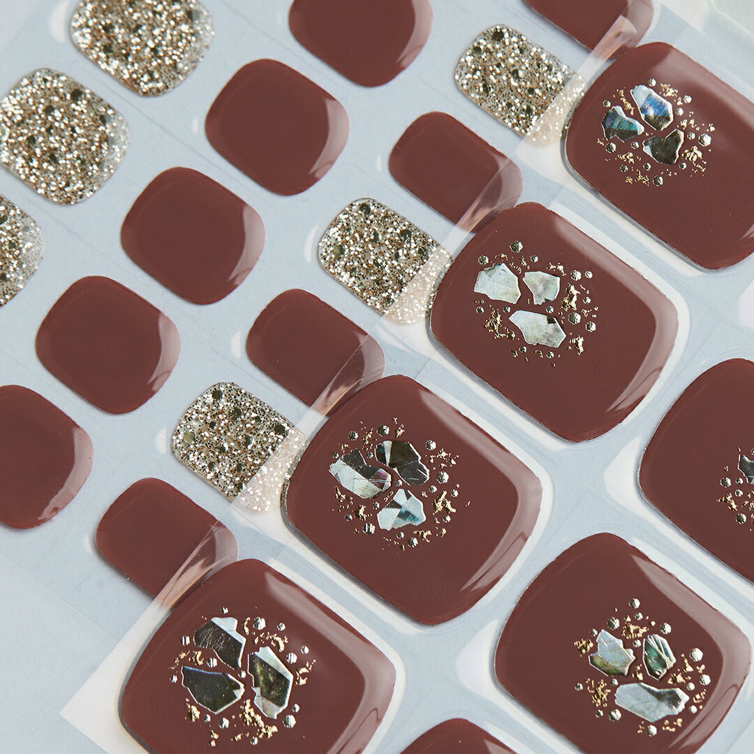 肌になじみのよいベージュピンク×きらびやかなゴールドグリッターのペディキュアデザインは、上品さと華やかさのバランスが絶妙。